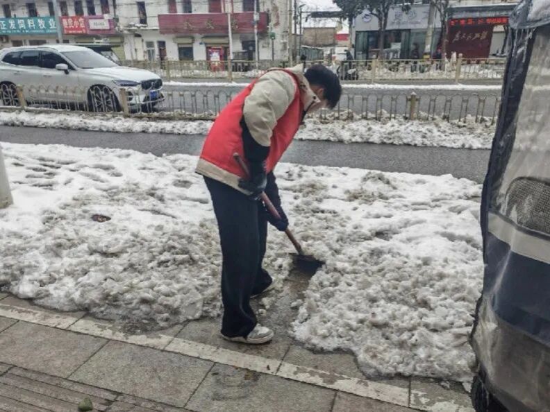信息工程学院(人工智能学院)张世博在蔡县街道公交站点附近进行扫雪作业