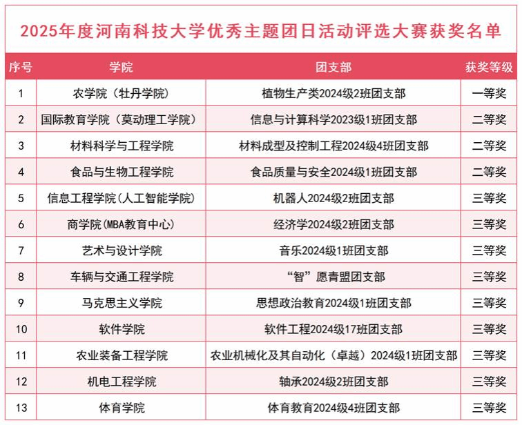 此次优秀主题团日活动评选大赛,既是对全校基层团日活动开展成效的一次集中检阅,更是凝聚青年思想、激发组织活力的重要平台。各团支部在交流互鉴中拓宽了工作思路,在比拼学习中凝聚了思想共识,充分彰显了河科大团员青年的责任担当与青春风采。